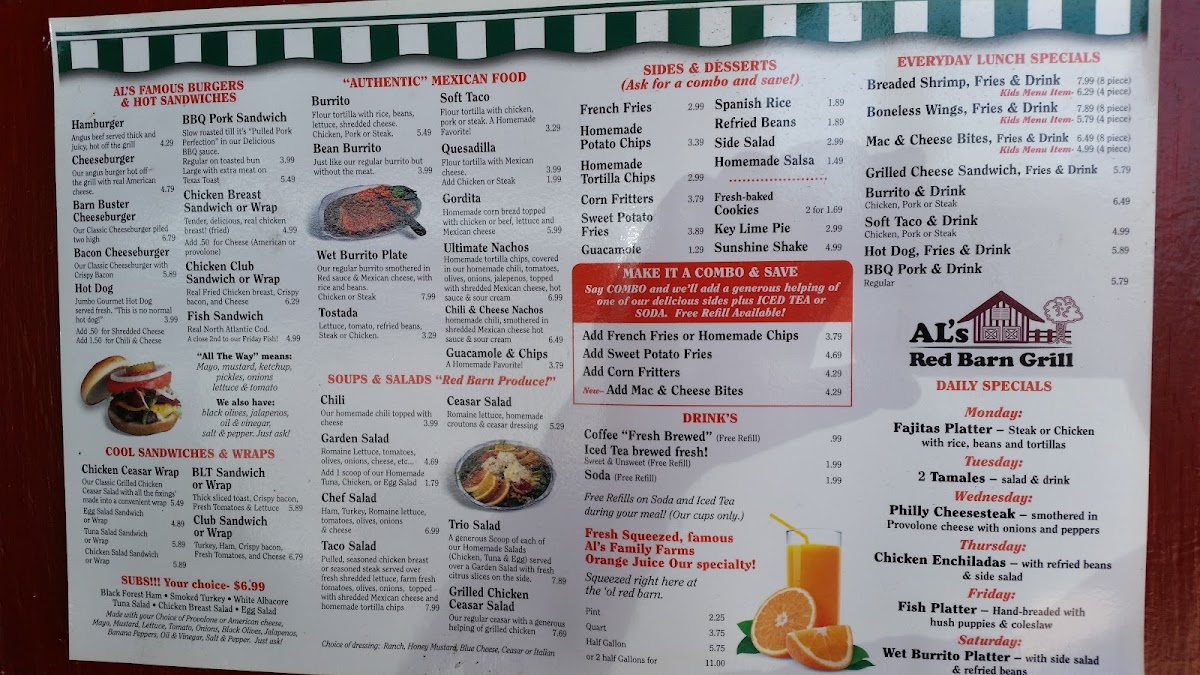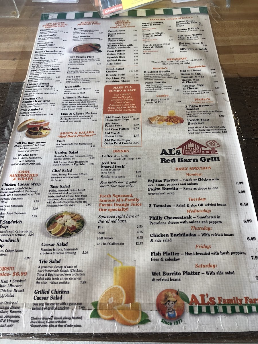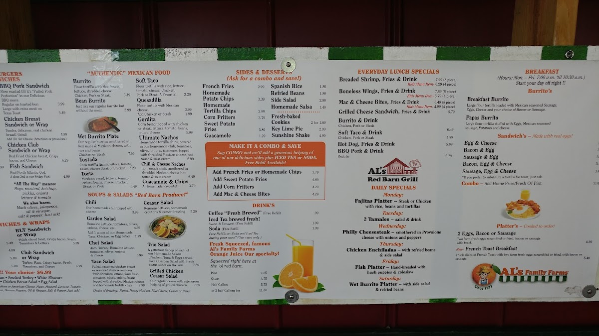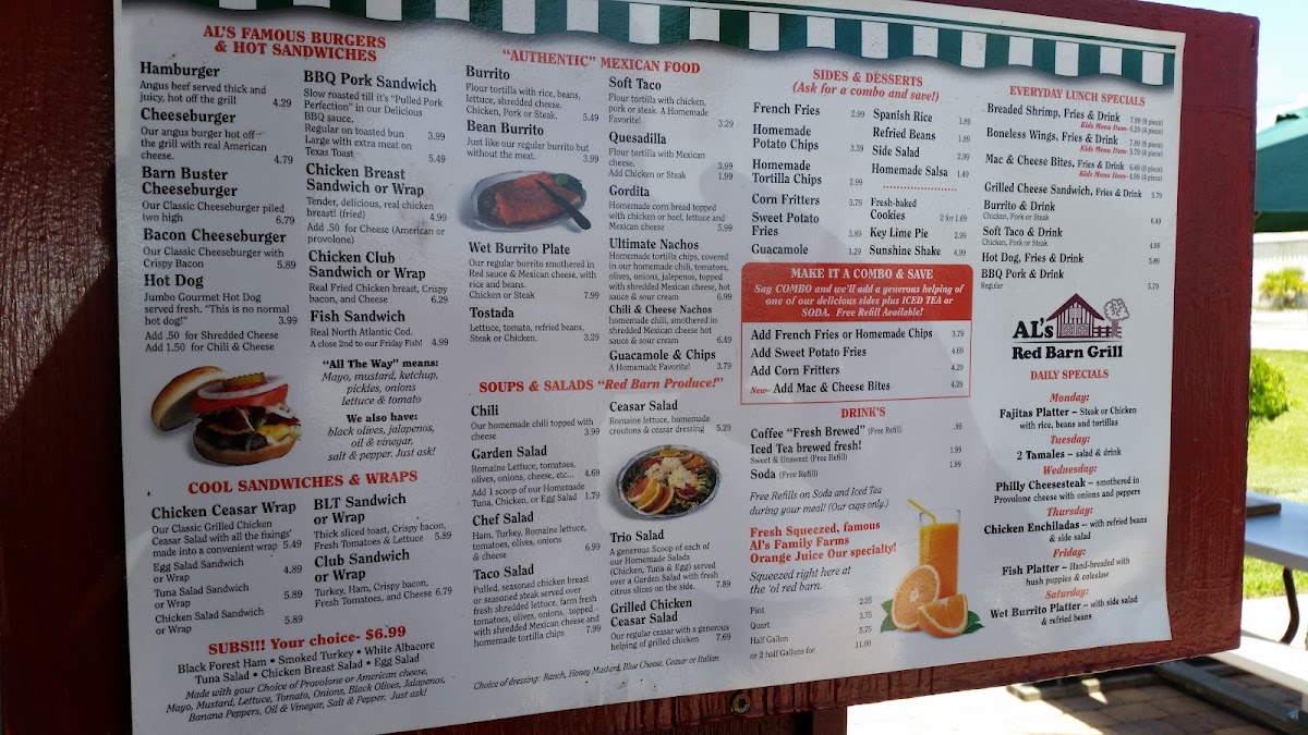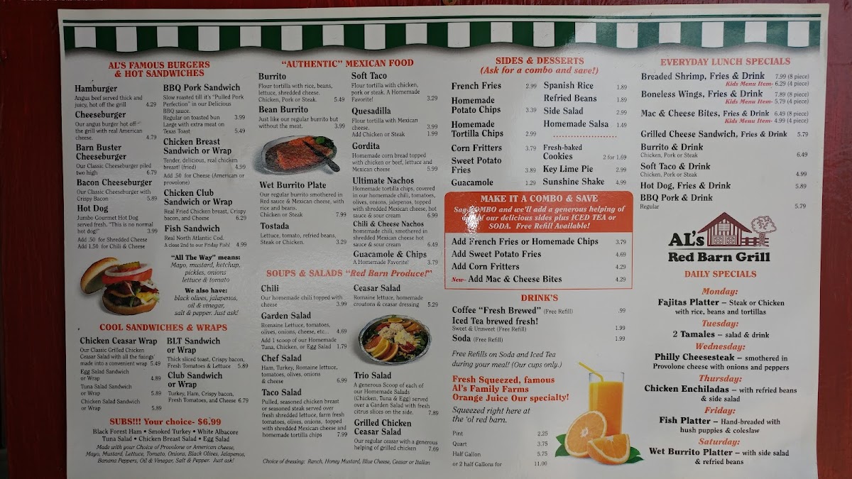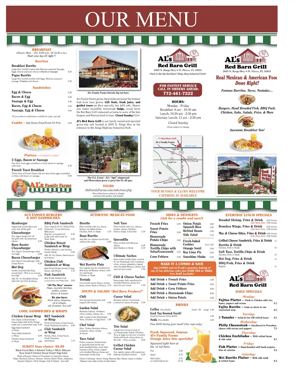 If you're looking for a great spot to enjoy delicious food in Fort Pierce, the Al's Red Barn Grill Menu has something for everyone. Located at 2005 N Kings Hwy, this local gem offers a cozy atmosphere perfect for casual dining. Whether you're in the mood for a juicy burger, some tender ribs, or a refreshing salad, you'll find plenty of options to satisfy your cravings. The menu features a mix of hearty comfort foods, all prepared with fresh ingredients and that signature smoky flavor that makes Al's Red Barn Grill stand out. From starters to desserts, every dish is made to be both satisfying and delicious. With its warm, welcoming vibe and a menu packed with flavor, it’s a perfect place to grab a bite with friends or family.