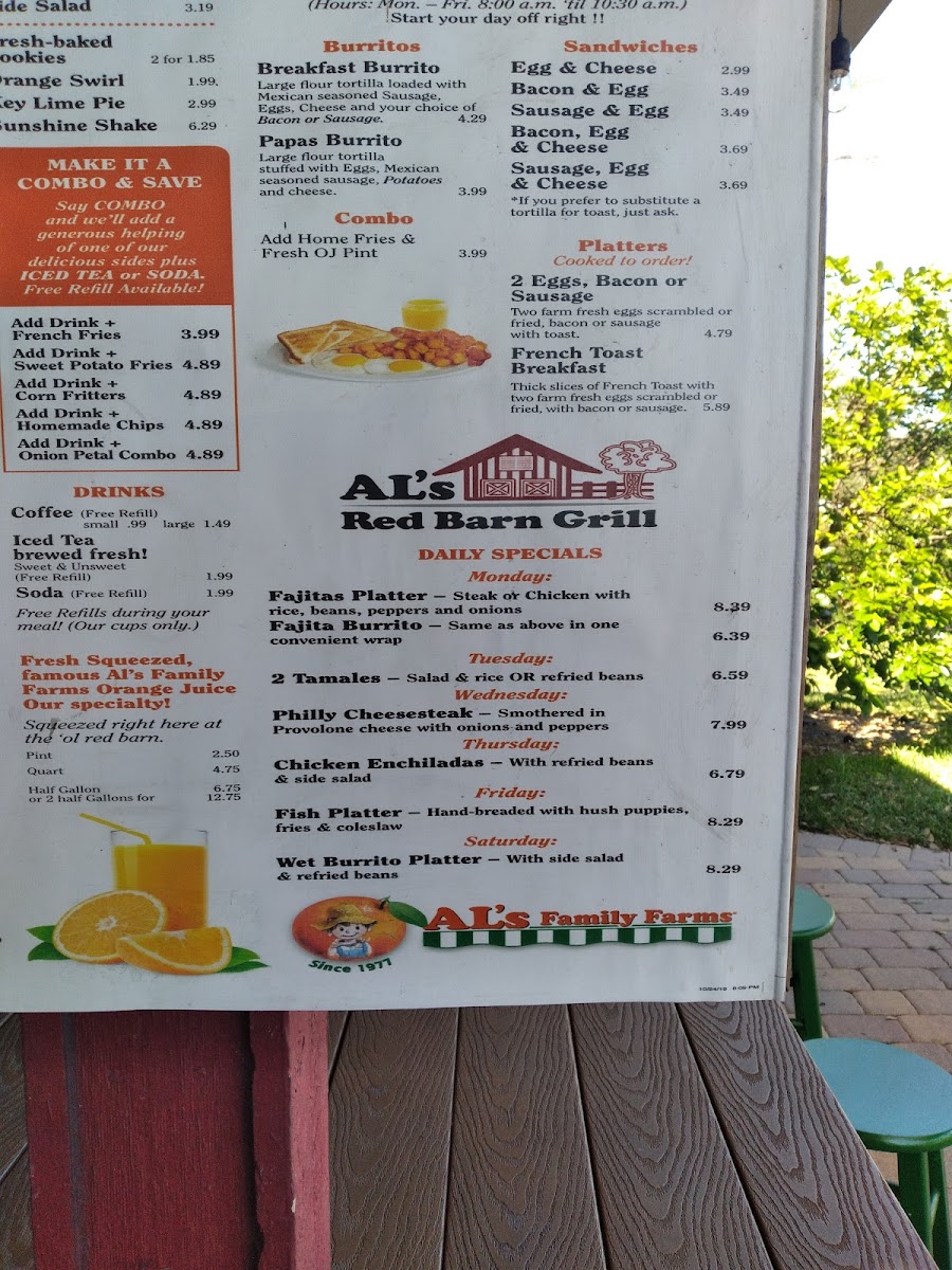 Fresh Squeezed, famous Al's Family Farms Orange Juice Our specialty! Squeezed right here at the 'ol red barn